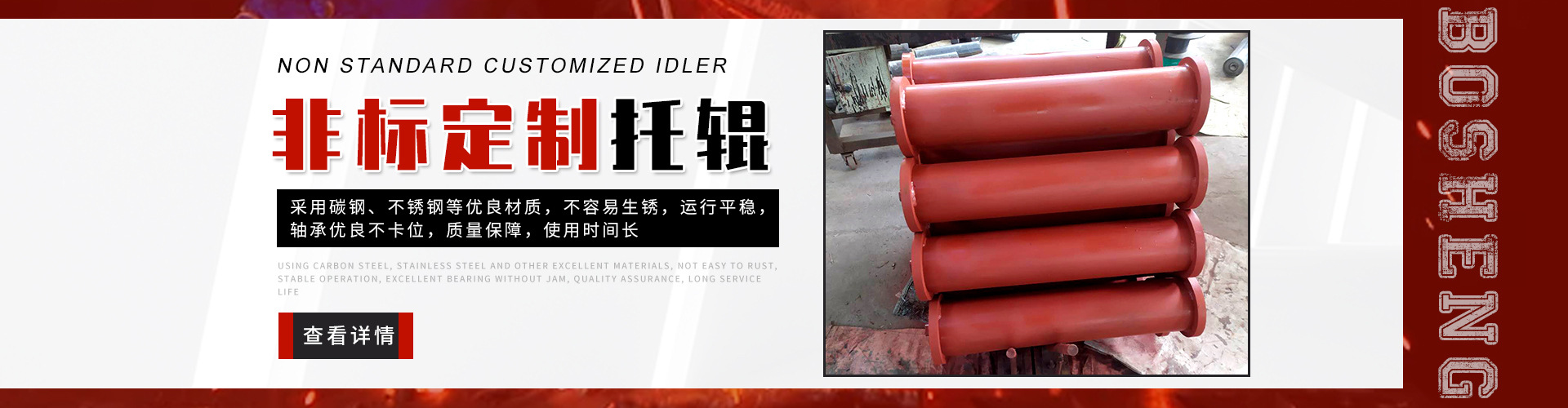 泰安博晟礦山機械有限公司位于山東泰安新泰市汶南鎮(zhèn)陳糧村。緊鄰京滬、京福、萊新高速公路。公路交通極為方便,環(huán)境優(yōu)美。公司主要生產(chǎn):托輥、托輥配件、托輥支架等皮帶輸送機配件。歡迎各界商友前來洽談考察。聯(lián)系電話:13954880316. 泰安博晟礦山機械有限公司采用國際標準設(shè)計、制造技術(shù),將托輥的設(shè)計和制造提高到了一個更高的水平,生產(chǎn)的托輥具有小的旋轉(zhuǎn)阻力,長的壽命,小的維修工作量和高的承載能力。鋼管采用托輥專用高頻焊管,管內(nèi)做去刺處理,圓度控制在特殊的公差范圍之內(nèi)。軸是按標準公差加工的冷拉鋼制造。軸承座采用進口冷扎鋼板經(jīng)多次工藝沖壓而成。托輥管和軸承座被自動焊接機械手焊接在一起,形成一個具有很高強度的整體構(gòu)造。托輥軸承采用國內(nèi)外知名品牌的大游隙深溝球雙密封軸承,使托輥具有理想的靜平衡和動平衡,其旋轉(zhuǎn)阻力優(yōu)于國標。托輥密封采用綜合國外和國內(nèi)迷宮式密封的特點進行了專門設(shè)計,內(nèi)充耐高速高溫和超低溫抗氧化鋰基酯,有效防止雜質(zhì)、水、空氣對托輥內(nèi)部的侵蝕。 目前我們托輥系列產(chǎn)品有槽形上調(diào)心托輥組、槽形托輥、槽形下調(diào)心托輥組、承載托輥、緩沖托輥、回程托輥組、螺旋托輥、摩擦上調(diào)心托輥組、平行緩沖托輥組、平行上調(diào)心托輥、礦用托輥、煤礦專用托輥、梳型托輥、樹脂托輥、陶瓷托輥、橡膠托輥、錐形托輥、立輥等。規(guī)格:直徑50-219mm;長度190-2600mm。 泰安博晟礦山機械有限公司竭誠愿與廣大客戶合作,共同發(fā)展開發(fā)新技術(shù)新項目。泰安博晟礦山機械有限公司秉承